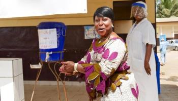 Dr. Doussou Touré arrives for work at Coléah Medical Centre in Guinea. She washes her hands from a bucket set up in front of the building, proceeds to a screening area where her temperature is checked and recorded and only then enters the bustling facility that she supervises.