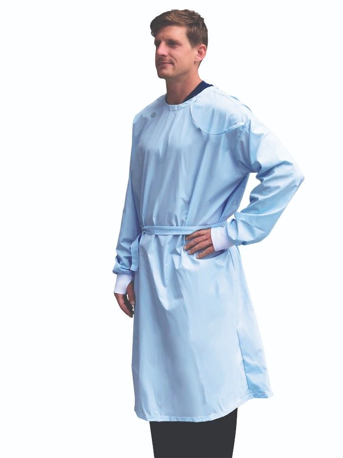 One of the key innovations of this new gown design is the pull cord at the front. “In previous gowns that we used, there's a tie in the back that you'd have to undo; you take your hands behind your neck and untie,” He explained that untying could be difficult for some people. However, she continued, “This new gown has a pull cord on the left shoulder. In 1 swift motion, when you pull down, that [movement] automatically will undo the snaps in the back. So that pull cord is something that we've not seen in isolation guys before.”