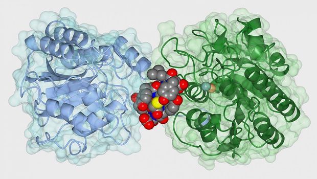 The cyclic peptide ipglycermide binds to an iPGM enzyme, blocking its activity. Courtesy of NIH