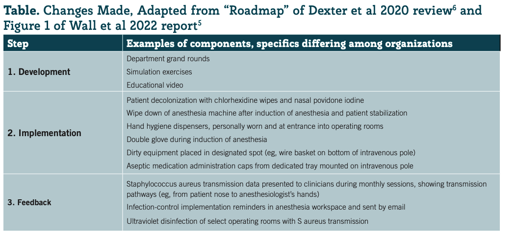 In conclusion, substantial understanding exists about how OR pathogens cause surgical-site infections. It is known that the processes involved include not only contaminated wounds and resistance to otherwise appropriate antibiotics, but also bacterial transmission including the anesthesia environment.2,5 Feedback to anesthesia practitioners contributes to reduced surgical-site infections because that transmission can be mitigated with basic measures (Table).2,5 There is considerable understanding of why and how best to use S aureus transmission as a marker of transmission for the purpose of feedback.4,8,9,11-13