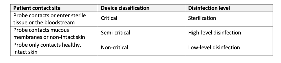 Under Spaulding, a device is classified as non-critical if it only contacts intact skin (Table 1). Devices that contact non-intact skin or mucus membranes are classified as semi-critical, while those that contact sterile tissue or the bloodstream are classified as critical. Semi-critical and critical devices require high-level disinfection (HLD) and the use of an FDA-approved sterile sheath at a minimum.1-3