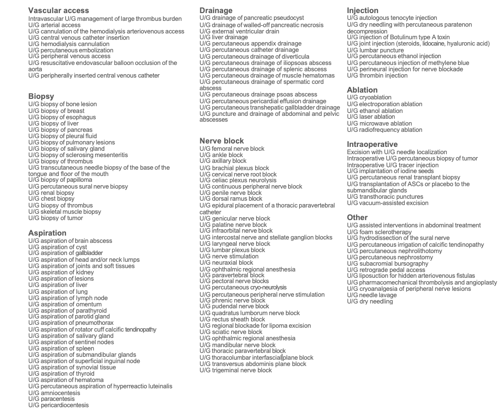 Table 2. A list of ultrasound-guided percutaneous procedures collated from our view of published literature. The 140 procedures can be broadly grouped into 9 different categories.