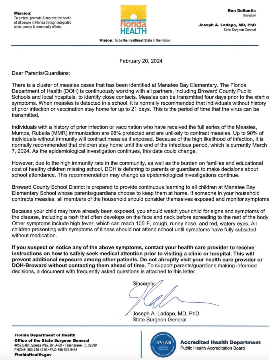 The letter sent by Florida Surgeon General Joseph Ladapo, MD, PhD after the measles outbreak in the state.