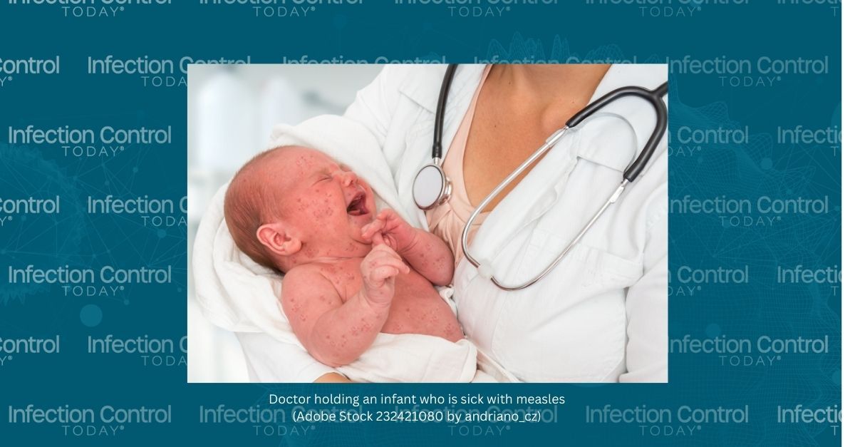 Doctor is holding an infant who is sick with measles. Could this have been prevented?(Adobe Stock 232421080 by andriano_cz)