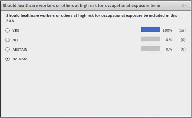 The final poll question which passed unanimously was: “Should health care workers or others at high risk for occupational exposure be included in this EUA”? It was clearly stated that this would include health care workers, other frontline workers (such as teachers) and potentially essential infrastructure workers.