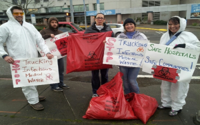Local activists continue to voice their objections at area hospitals over the practice of trucking infectious medical waste through local communities to be treated at a remote facility. As Safe Hospitals Safe Communities spokesperson Debra Pelletier notes, "We are visiting area hospitals to raise awareness about the transportation of medical waste through local communities and ask for safer disposal of medical waste. Nearly 1,000 hospitals now use on-site sterilization technologies that prevent infectious medical waste from being trucked through our neighborhoods, thus stopping the spread of infectious pathogens and preventing possible accidents and spills."