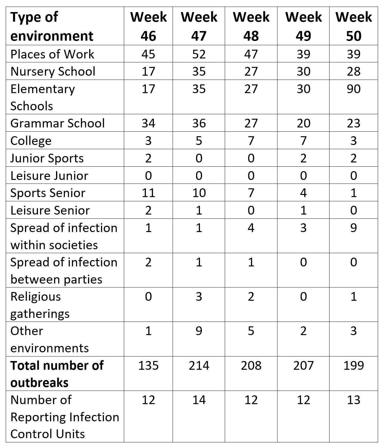 Table. Sweden for Year 2020: Number of outbreaks in environments for the public (Non-Medical) per week.