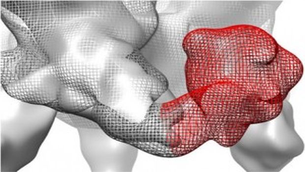 New visualization of the V2 variable loop of the HIV Env protein (red) puts it at the bottom of the structure. (Image courtesy of Cheng lab/UC Davis)
