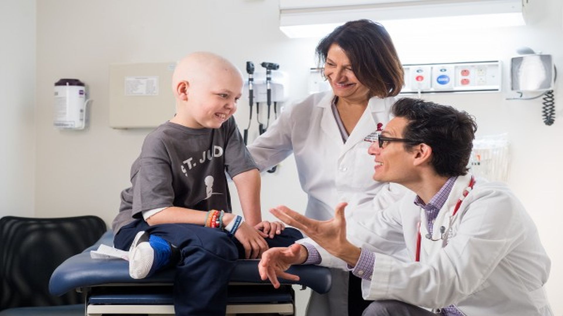 A patient is pictured with senior author Sima Jeha, MD, a member of the St. Jude Department of Oncology and lead author Joshua Wolf, MD, an assistant member of the St. Jude Department of Infectious Diseases. Courtesy of Seth Dixon/St. Jude Children's Research Hospital