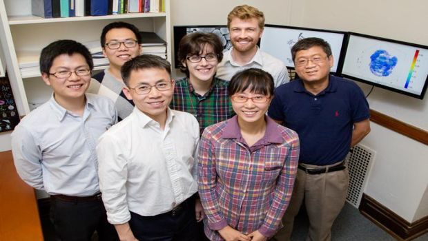 A team of researchers developed a new broad-spectrum antibiotic that kills bacteria by punching holes in their membranes. Front row, from left: materials science and engineering professor Jianjun Cheng and postdoctoral researcher Yan Bao. Back row, from left: postdoctoral researcher Menghua Xiong, graduate students Ziyuan Song and Rachael Mansbach, materials science and engineering professor Andrew Ferguson, and biochemistry professor Lin-Feng Chen. Photo by L. Brian Stauffer