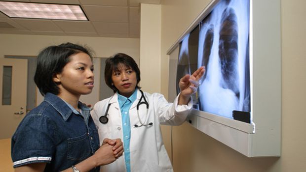 A doctor discusses an X-ray with a patient. Photo courtesy of the CDC.