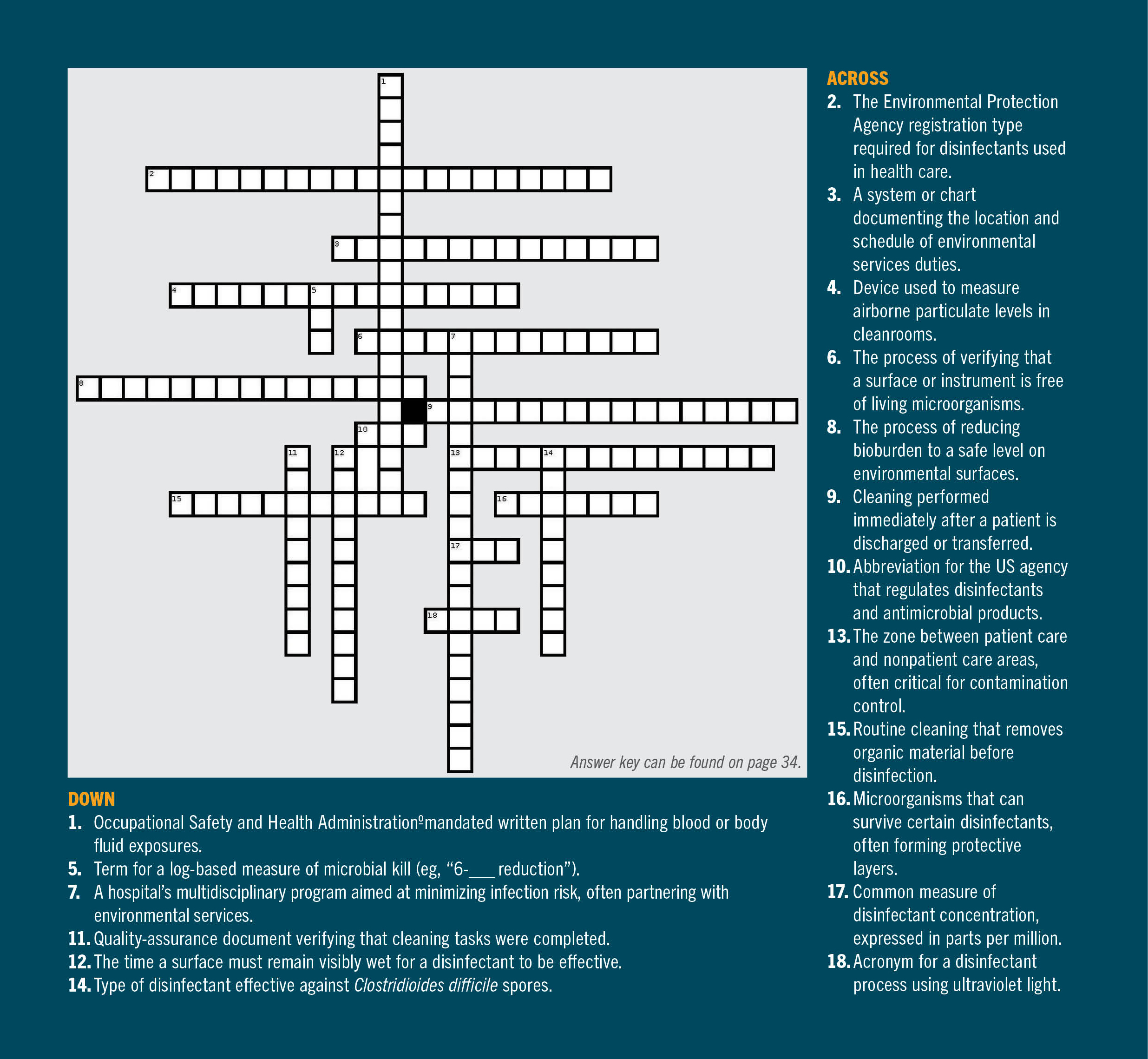 Do you think you know your way around disinfection protocols, cleaning validation, and environmental services (EVS) terminology? This challenging crossword is designed for EVS professionals and infection preventionists who want to test their technical knowledge. From precleaning procedures to regulatory acronyms, each clue digs a little deeper into the science and practice of keeping health care environments safe. Grab a pen—or gather your team—and see how many you can solve without peeking at the answer key!