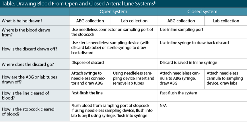Table. Drawing Blood From Open and Closed Arterial Line Systems8