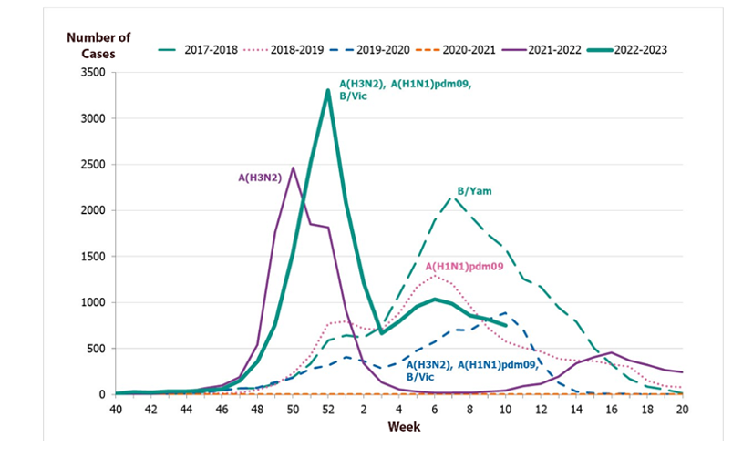 Figure: Number of laboratory-verfied influenza cases (all types) per week, this season and previous seasons. The chart indicates which subtype or line type dominated each season.