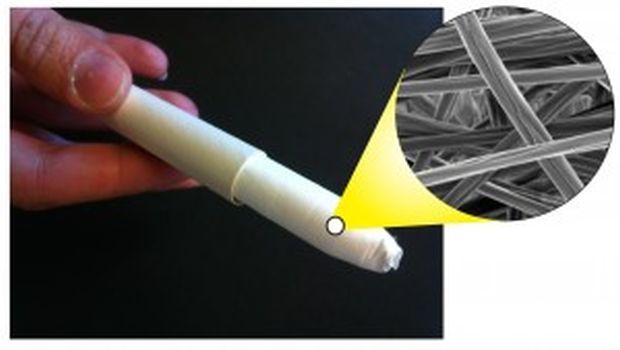 The UW’s dissolving fibers could be spun and placed within an applicator, similar to those used to insert a tampon. The inset image shows the quick-release fibers magnified 5,000 times. Image courtesy of University of Washington