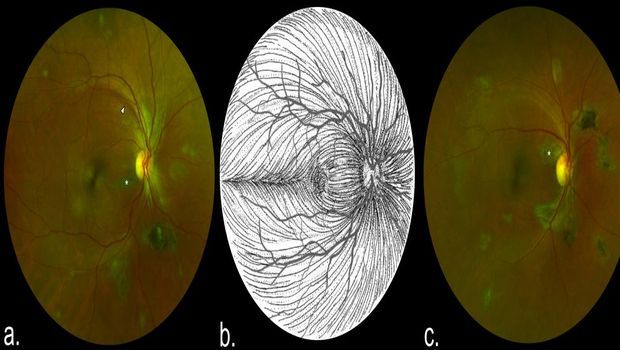 These are composite scanning laser ophthalmoscope retinal images showing type 6 Ebola peripapillary or peripheral lesions, observed following the anatomic distribution of the ganglion cell axon (retinal nerve fiber layer), in a case-control study of ocular signs in Ebola virus disease survivors, Sierra Leone, 2016. A) Example 1, right eye. B) Illustration of the ganglion cell axon anatomic distribution. Courtesy of W.L.M. Alward. C) Example 2, right eye. Asterisks indicate curvilinear lesions distinct from the retinal vasculature. White arrowhead indicates retinal nerve fiber wedge defect. Courtesy of University of Liverpool