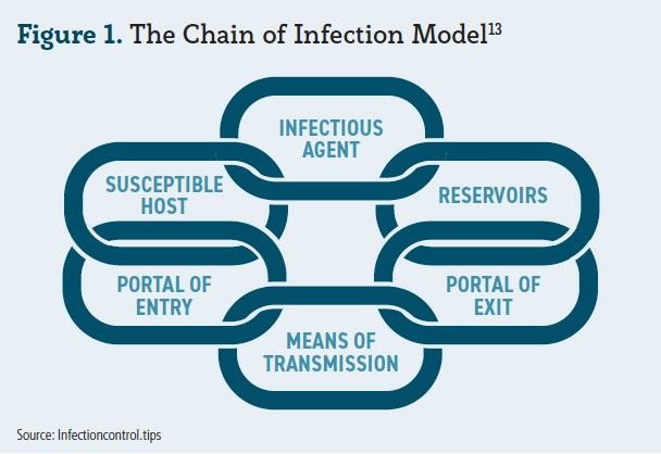 Understanding the transmission ecosystem is the next step toward mitigating HAIs. It is a complex mix that involves infectious agents, patient susceptibility, and infection control practices. The source of the infectious agent is the first link in the chain of infection. Hence, the key to breaking the chain (Figure 1) is to address the source and disrupt its transmission.13