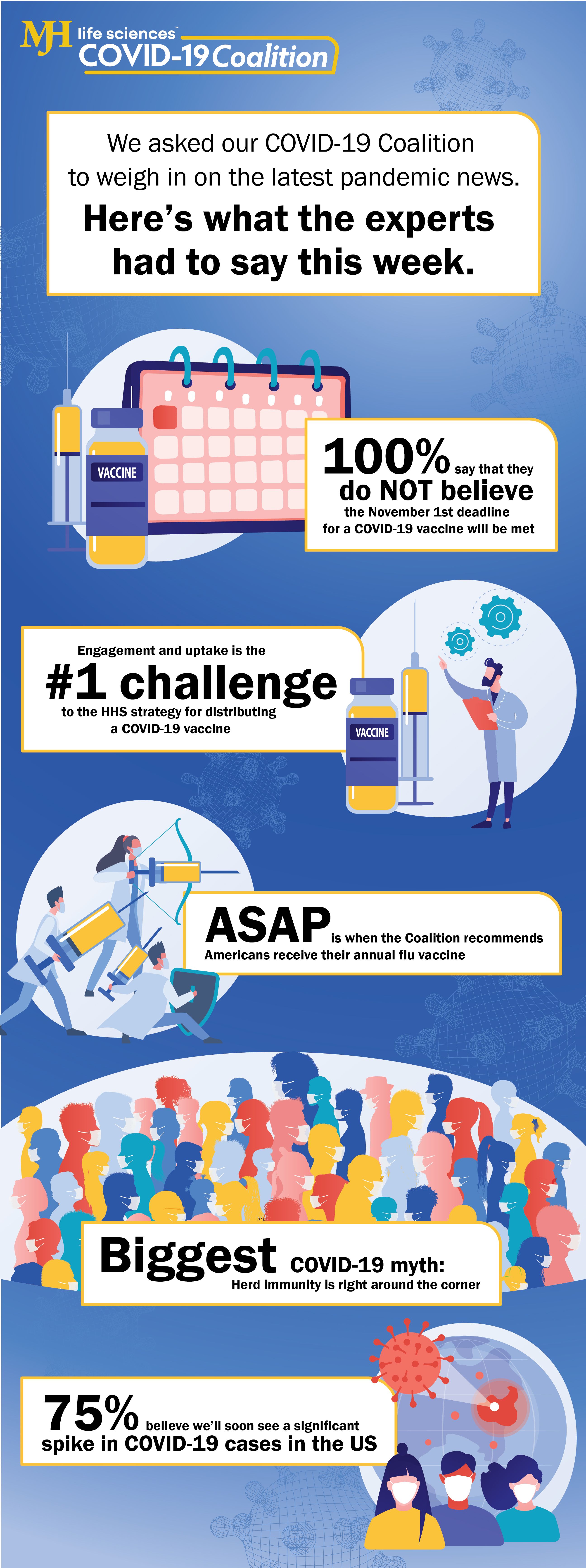 Don’t expect a vaccine for coronavirus disease 2019 (COVID-19) to show up on November 1 this year, say healthcare experts. The MJH Life Sciences COVID-19 Coalition does not believe that a COVID-19 vaccine will be released by then, while identifying engagement and uptake as the top challenge to the US Department of Health and Human Services vaccine distribution strategy. Coalition members also say that Americans should receive the flu vaccine as soon as possible, according to the graphic.