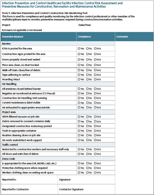 The IP can think about mandating formal training or competency testing for the project managers and construction personnel implementing infection prevention suggestions. Health care facilities frequently require tuberculosis testing and immunizations for staff members, including external contractors who often operate in patient care areas. Additionally, programs can detect workers who are actively coughing or have exposed skin rashes and prohibit them from working in the regions that provide patient care.