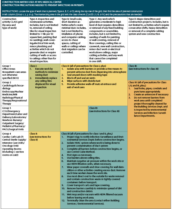 Infection Control Risk Assessment (ICRA)6 is a process to assess the impact of construction and renovation work in health care facilities on infection control programs and practices and to ensure that new construction is designed to meet the needs of the anticipated patient population.1,2 IPs can actively participate in the design and oversight of health care construction and renovation projects by actively participating in the processes that assess and mitigate infection risks to patients, health care workers, and visitors. This article discusses infection control’s role in the construction and renovation of health care facilities.