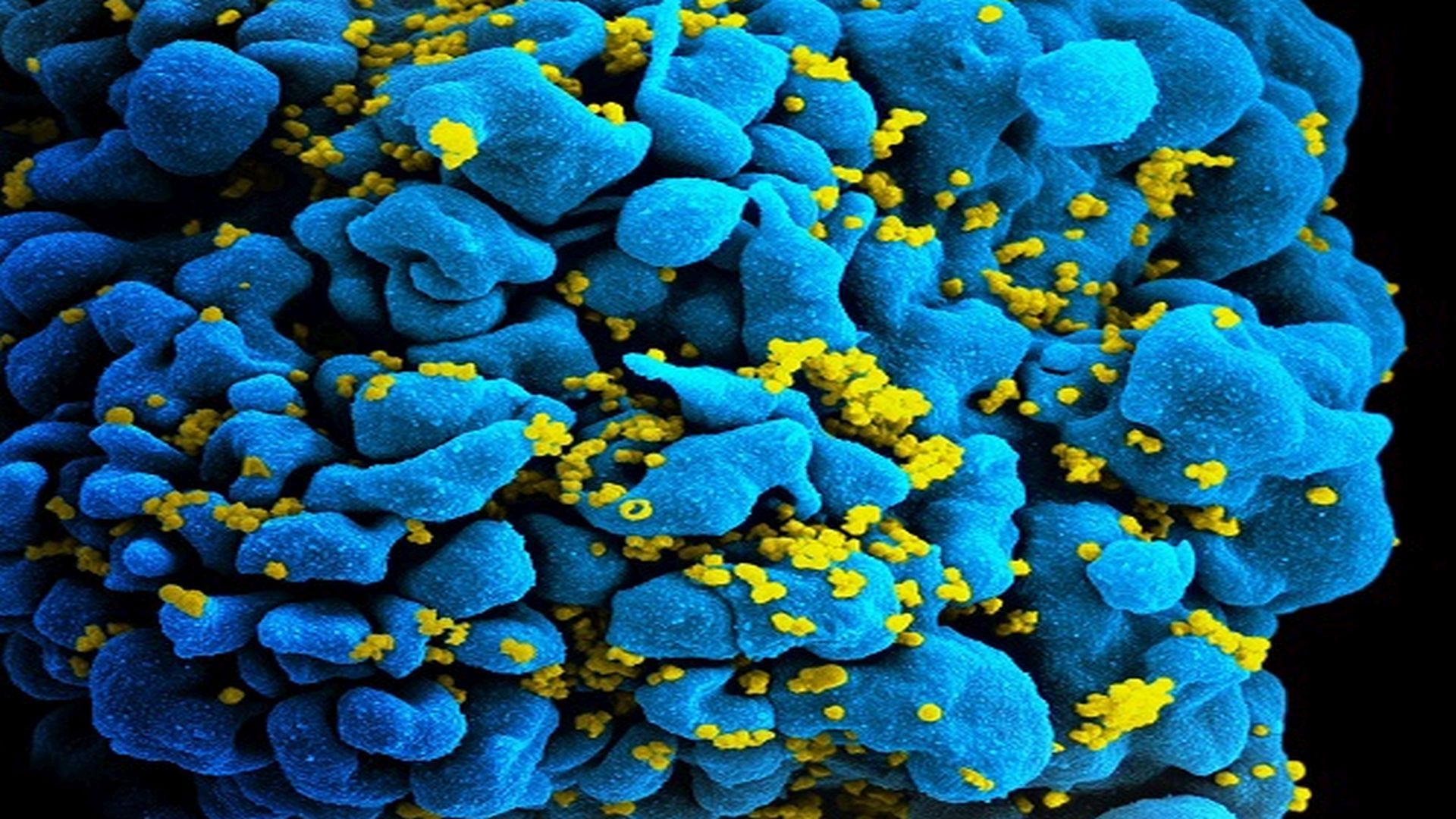 Scanning electromicrograph of an HIV-infected T cell. Courtesy of NIAID