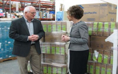 In early December 2011, Georgia-Pacific presented 4,182 cases of Georgia-Pacific Professionals Pacific Garden® General Purpose Gentle Foam Soap and 1,440 Pacific Garden® dispensers to the Green Bay Area Public School District (GBAPSD) in Wisconsin to help prevent the spread of cold and flu in area schools. Dr. Michelle Langenfeld, superintendent of GBAPSD and Randy Harbath, vice president of manufacturing for the Georgia-Pacific Broadway facility were in attendance.