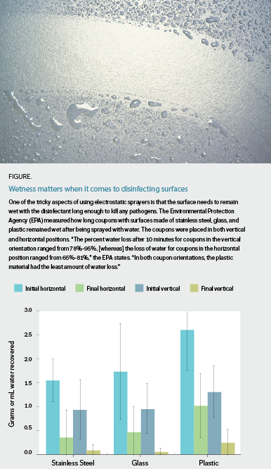 A team of EPA investigators compared several spray parameters for 6 electrostatic sprayers, 2 foggers, and 1 hand-pumped garden sprayer.12 “The electrostatic spray process is complicated and involves multiple physical phenomena,” they wrote in PLoS One on November 30, 2021. Parameters that might affect a disinfectant’s ability to inactivate the virus on surfaces include spray droplet size distribution, electrostatic charge, ability of the spray to wrap around objects, and loss of disinfectant chemical active ingredient due to the spray process. Also, not all electrostatic sprays carry the same charges. In this study, 2 ESSs that used alternating current had a negative charge, whereas the battery-powered ESS carried a positive charge.