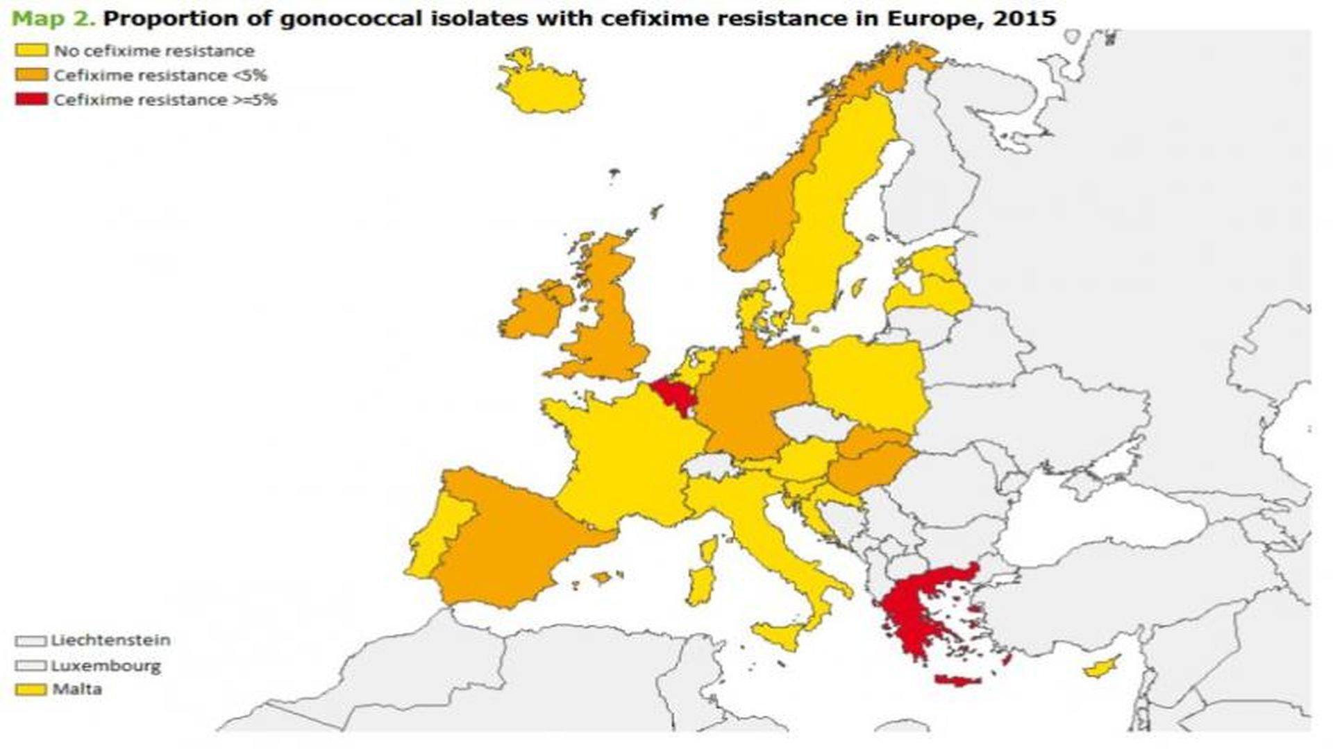 A trend of decreasing cefixime resistance has been observed since 2010 across Europe: in 2015, cefixime resistance was detected in nine countries, compared to 10 in 2014 and 13 in 2013. Courtesy of ECDC