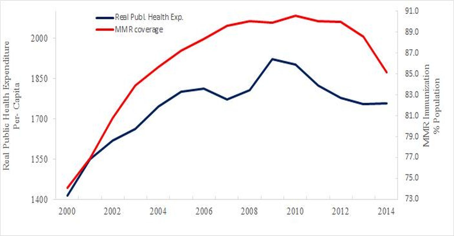 "We observed that public health expenditure in Italy steadily rose from 2000 to 2009 at an average rate of 3.5% per year, while it dropped by about 2 percent per year between 2010 and 2014. Similarly, MMR coverage rose from 74.1 percent in 2000 to 90.6 percent in 2012, and then reversed its course, falling to 85.1 percent in 2014, far from the 95 percent herd immunity level," Toffolutti says.