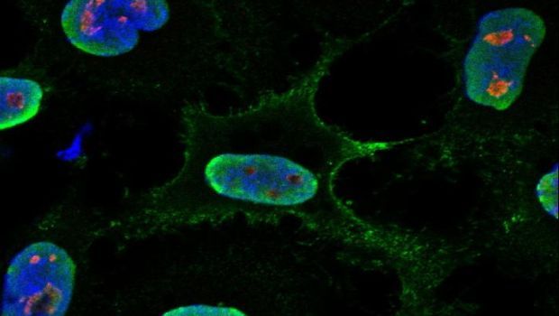 Infection of human cells with Hendra virus (green) is critically dependent on fibrillarin (red), a host protein that resides deep within the cell nucleus (blue). Courtesy of Deffrasnes, et al.