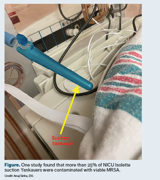One situation in which sampling has been encouraged is to help with outbreaks of disease in a unit when epidemiological evidence points to possible environmental links. This is a situation where a NICU IP would need to obtain new data based on swab sampling of specific sites within the unit. In 1 such study of a NICU, in response to sporadic increases of methicillin-resistant Staphylococcus aureus (MRSA) infections in neonates, microbiologists from the University of Tennessee at Chattanooga’s Clinical Infectious Disease Control Research Unit (CIDC) sampled nearly 50 different NICU environmental surfaces and found widespread contamination. In that NICU, the 2 most MRSA-contaminated sites were the return air ducts, which were contaminated with dust, and unit floors.8 By having data to help focus cleaning and disinfecting in the NICU, the IP and medical director were able to reduce the problem that dust plays in the unit, while floor contamination with MRSA remains a continuing problem.1 Additional studies of staphylococcal contamination within this NICU have indicated that other sites, including locations within Isolettes where neonates sleep, have viable MRSA present. Of Isolette sample sites, 25.7% of suction Yankauers swabbed had high levels of viable MRSA (Figure).9 This suggests that the work of the IP and the CIDC had not been completed in this NICU. As suggested in CDC guidelines, routine environmental sampling for pathogens in health care facilities is warranted as part of an ongoing process focused on reducing the threat of patient infection.