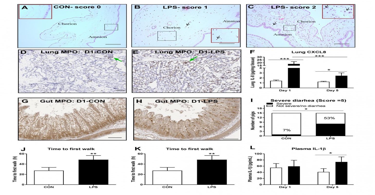To induce prenatal inflammation, the bacterial endotoxin lipopolysaccharide (LPS) was injected into the amniotic sacs of prenatal pigs. LPS and control groups were analyzed at birth, three days after birth, and five days after birth (formula feeding).