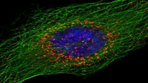 HIV-1 viral cores (red) accumulate around the cell nucleus (blue) but remain unable to enter following depletion of the motor protein KIF5B. Courtesy of Loyola University Chicago