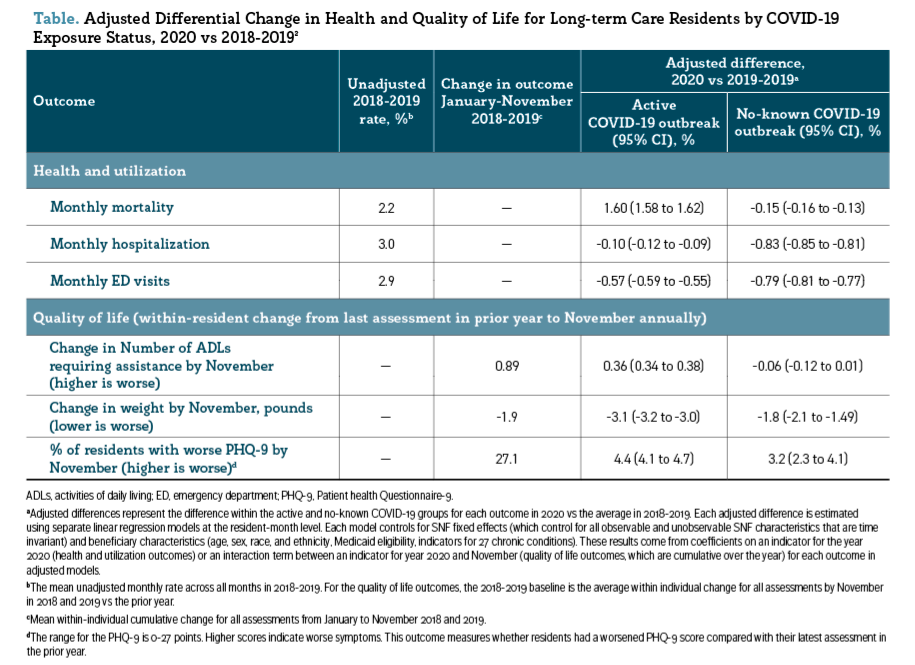 Staff in LTC facilities faced many unique and difficult challenges during the COVID-19 pandemic. Infection preventionists were tasked with balancing strict infection control guidelines with the hardship those measures imposed on residents and staff. Because of the multitude of regulatory changes over the past 32 months, pandemic fatigue relating to PPE use, testing, and isolation has led to high levels of staff turnover and notable decline in residents’ overall health. According to one investigation,2 during the first year of the pandemic, nursing homes with active COVID-19 cases experienced significant increases in weight loss and depressive symptoms among residents. Even facilities that did not have known COVID-19 cases experienced adverse changes in some health and quality of life measures. (See Table.2)