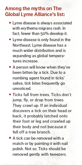 AM and WH: The Global Lyme Alliance [GLA] released a list of common Lyme disease myths. Such misperceptions can impede effective prevention and treatment. Among the myths on GLA’s list: Lyme disease is always associated with erythema migrans rash. In fact, fewer than 50% of patients. See Figure.