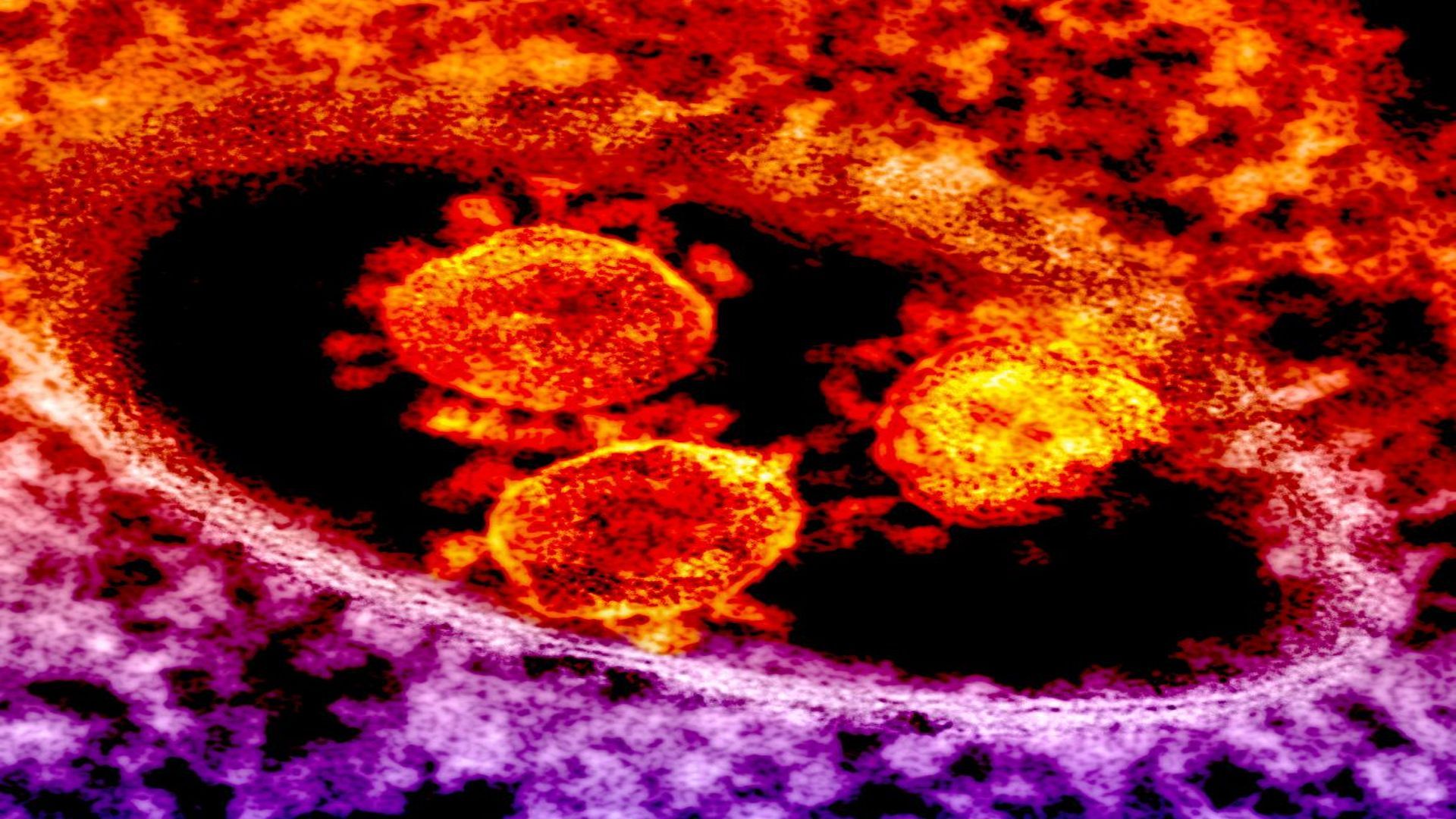 The round, spiked objects at center are MERS coronavirus particles. Courtesy of NIAID