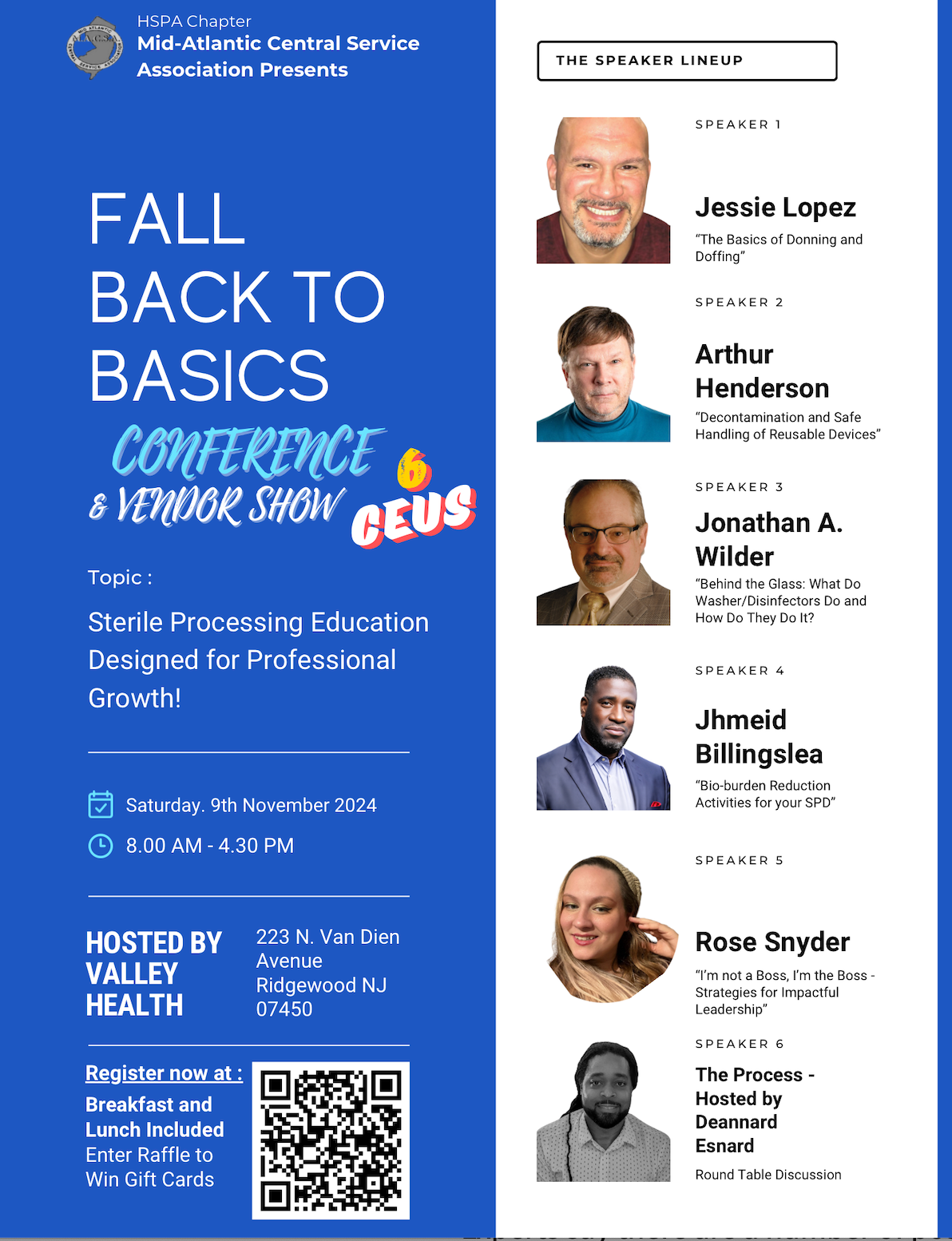 The Fall Back to Basics Conference & Vendor Show is an exciting event designed to enhance the knowledge and skills of sterile processing professionals. This conference, scheduled for November 9, 2024, at Valley Health in Ridgewood, NJ, is a full day of learning, with 6 expert speakers covering essential topics in sterile processing. Each speaker brings experience and expertise to help attendees grow in their careers, aiming to improve patient safety and operational efficiency in sterile processing departments.