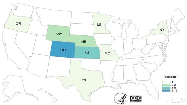Illnesses started on dates ranging from May 21, 2016 to July 20, 2016. Ill people range in age from less than 1 year to 72, with a median age of 30. Fifty-three percent of ill people are female. Five ill people have been hospitalized, and no deaths have been reported.