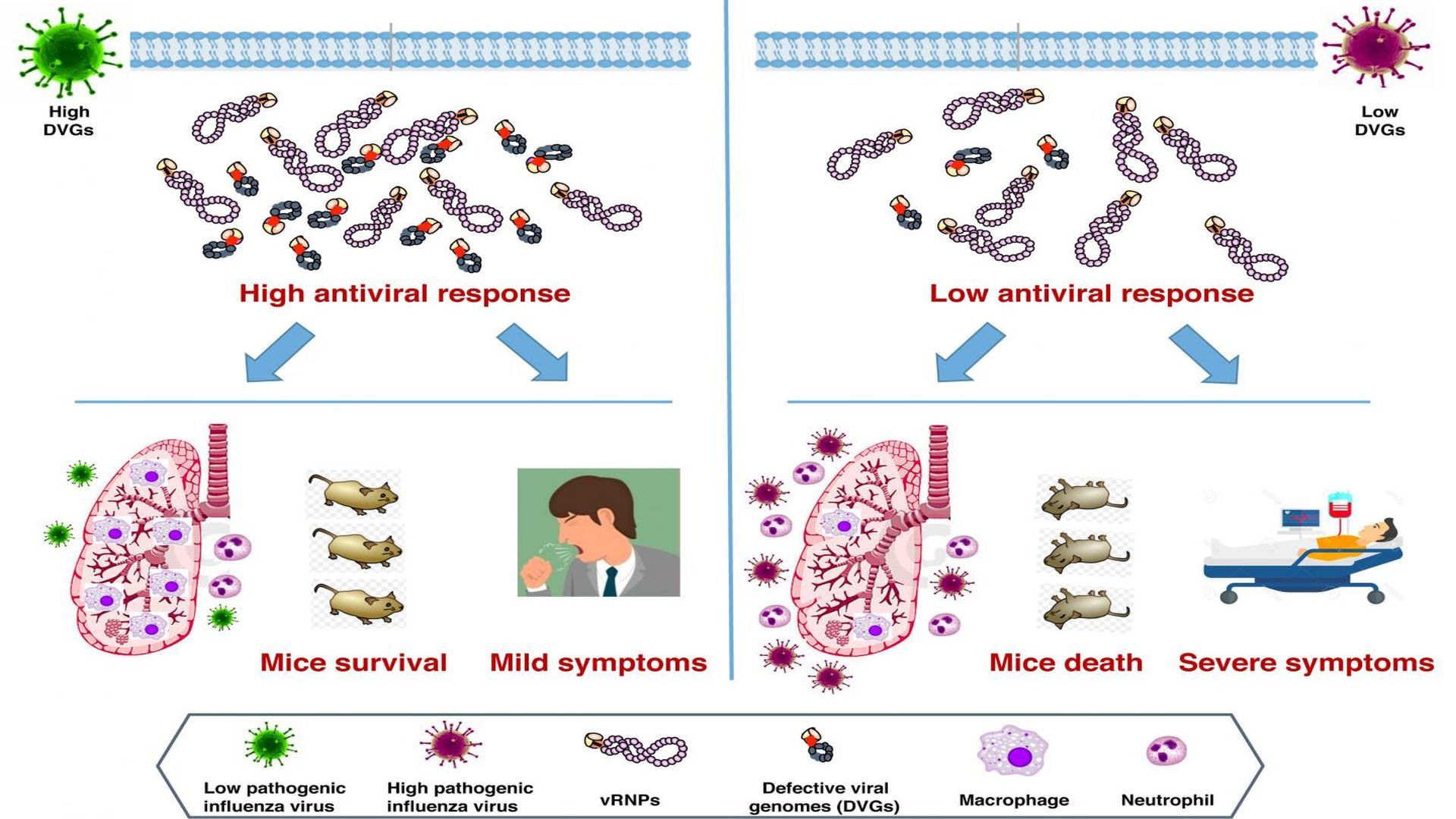 Together, these results suggest that low levels of DVGs may indicate greater risk of severe disease in patients infected with influenza A virus. With further research, these findings could help predict flu severity, guide patient treatment, and inform flu prevention strategies.