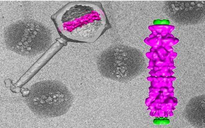 In the background, cryo-electron micrographs of purified viruses with their inner structure bubbling from radiation damage. Overlaid, (left) 3D computer reconstruction of a virus's outer shell and tail in gray, with the inner structure in magenta; (right) blow-up of the inner viral structure in magenta.