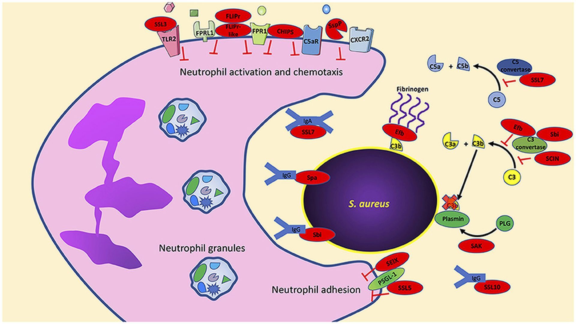 S. aureus has an arsenal of virulence factors to inhibit neutrophil activation, chemotaxis, and phagocytosis. Multiple virulence factors produced by S. aureus target key host effector proteins, for example, Efb, Sbi, and SCIN target the complement protein C3 convertase to prevent formation of C3a and C3b. Further studies are needed to determine if the production of these virulence factors are truly redundant or if they have multiple host targets as is the case with Sbi, which also targets immunoglobulins. Bacterial components indicated in red. PLG, plasminogen; SAK, staphylokinase; SspP, staphopain A.