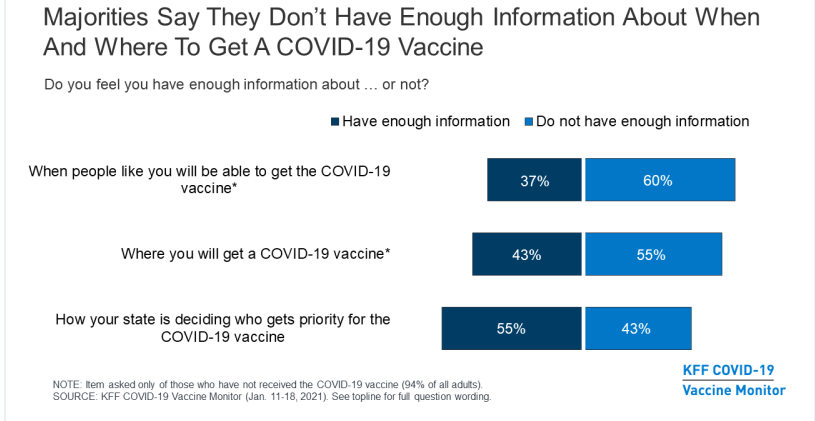 Unfortunately, the vaccine rollout hasn’t gone as planned, to say the least. A poll released today by the Kaiser Family Foundation (KFF) finds that Americans are growing impatient with stalled distribution efforts and the fact that vaccine supply cannot keep up with demand. The KFF poll “finds two-thirds of U.S. adults (65%) say the federal government is doing a ‘fair’ or ‘poor’ job of distributing vaccines to the states. About three in ten adults give the federal government a positive rating of ‘excellent’ or ‘good’. Likewise, six in ten think their state government is doing a ‘fair’ or ‘poor’ job of distributing the vaccine to people in their state.”
