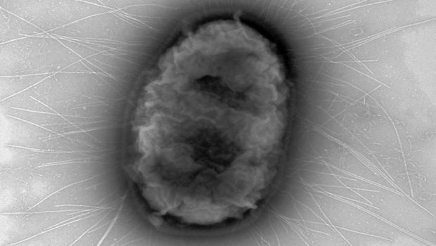 This is an electron micrograph of a single E. coli bacterium of the pandemic H30 strain. Courtesy of Dagmara Kisiela/Univeristy of Washington