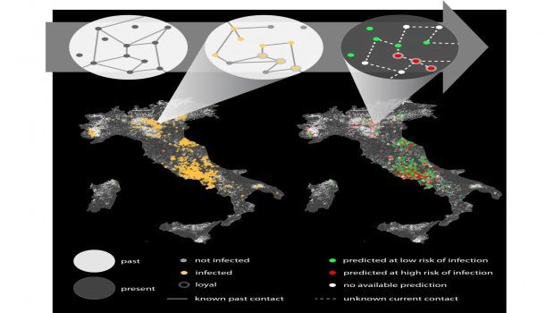 Nodes represent animal holdings and links represent cattle movements. Top white circles (left and center) map the contact networks in the past and allow the identification of loyal nodes (grey contour surrounding the nodes). A disease spreading simulation run on past contact data (top center circle and left map of Italy) provides the infected farms (yellow nodes) in the simulated scenario. Coupled with the loyalty analysis, this numerical information allows us to predict which farms would be at high risk (red, or low risk, green, top right circle and right map of Italy) of infection if an outbreak would occur with the same epidemiological conditions, without the need of knowledge of the current network of contacts (dashed lines). Image courtesy of Valdano et al.