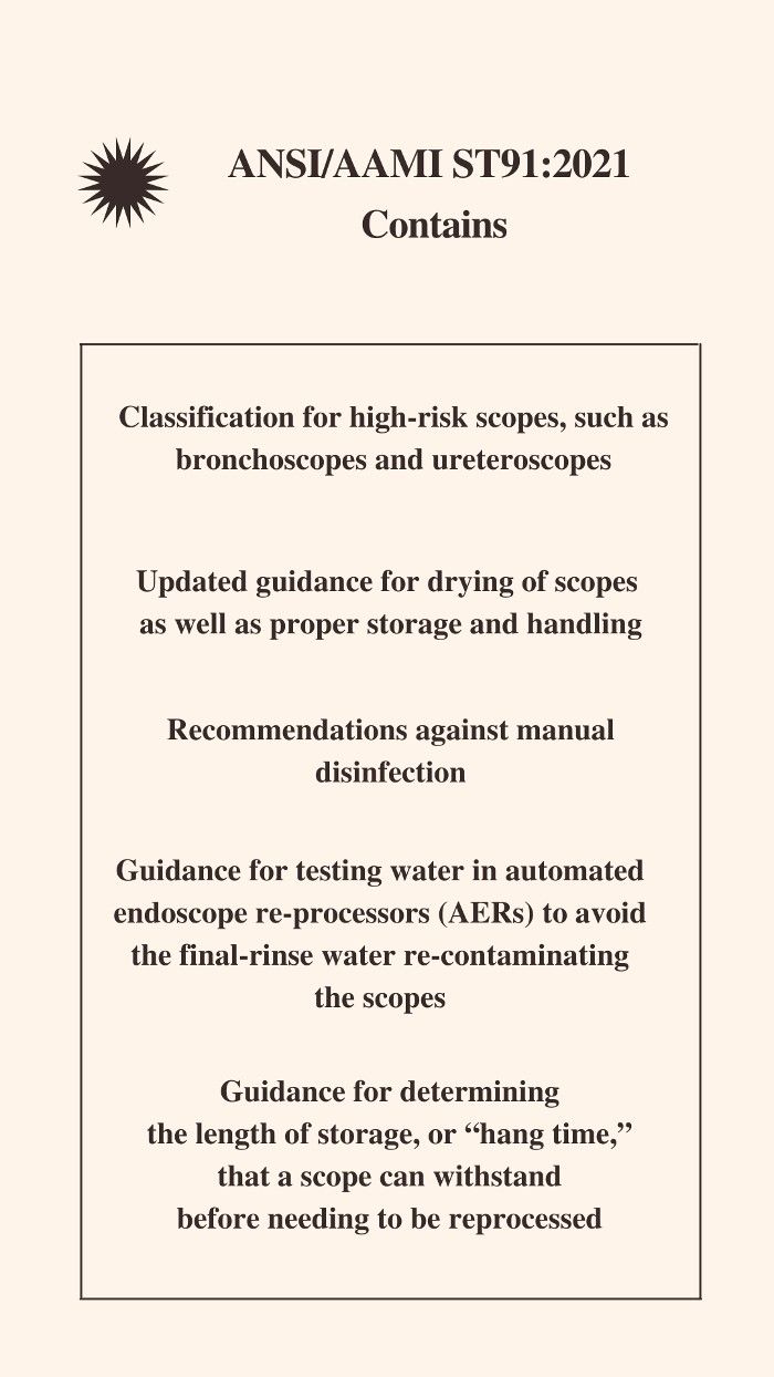 After 7 years, the American National Standards Institute (ANSI) and the Association for the Advancement of Medical Instrumentation (AAMI) have updated their guidance for disinfection/sterilizing, storage, and quality control procedures of medical devices. The recently published document, ANSI/AAMI ST91:2021, Flexible and Semi-Rigid Endoscope processing in Health Care Facilities, discusses the processes and procedures to avoid multidrug-resistant organism infection outbreaks related to flexible endoscopes. This updated guidance is intended for any location these instruments are used.