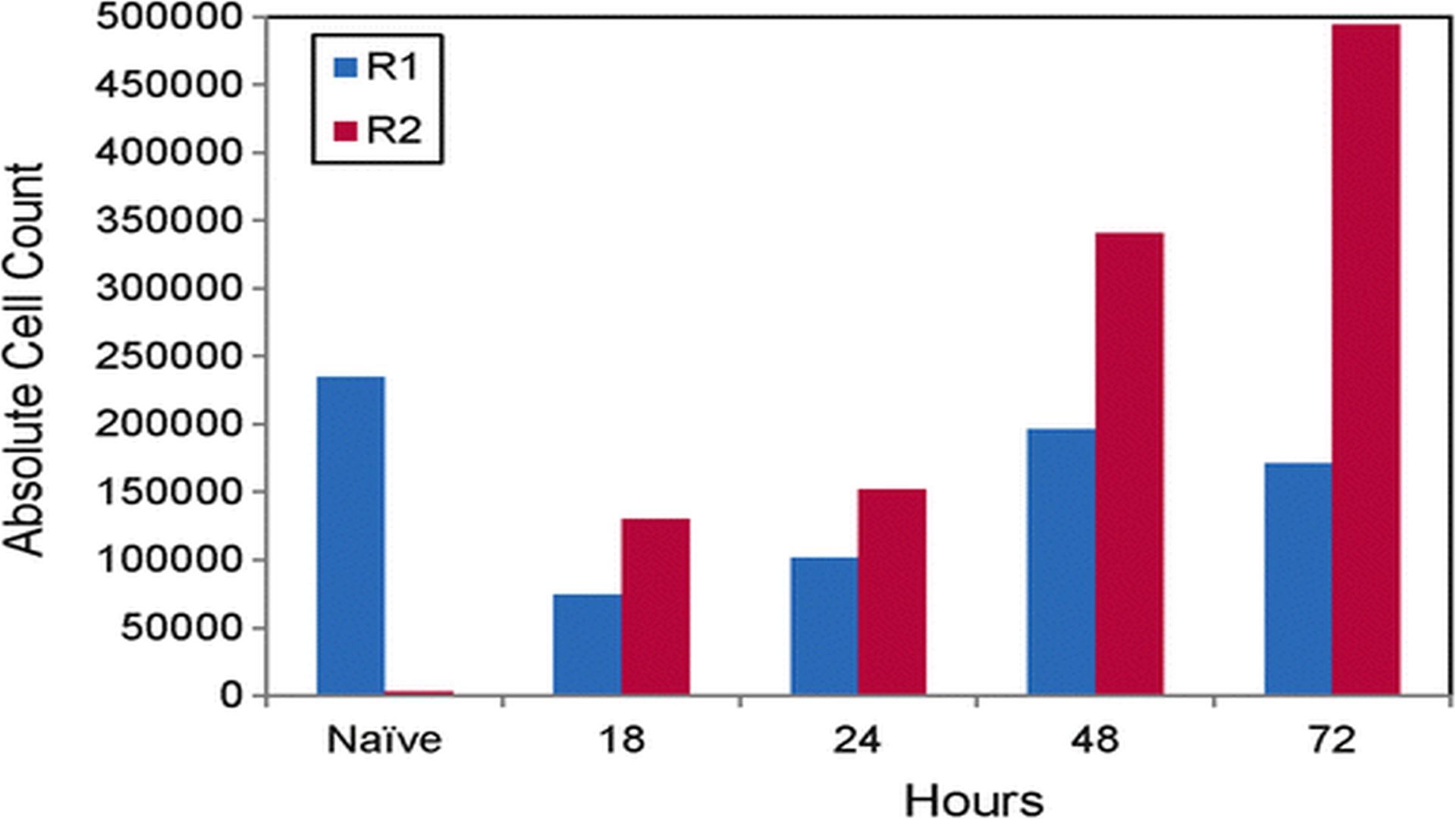Cell counts for ramified microglial (R1) and infiltrating macrophage/activated microglial (R2) cell populations. Absolute R1 and R2 cell population counts obtained during sorting of cells isolated from naive mice and mice from the 18, 24, 48, and 72 h time points (20 mice per group) are shown.