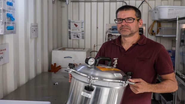 The station built into a standard 20-foot steel shipping container houses all the equipment necessary to prepare surgical instruments for safe reuse, including a water system for decontamination and a solar-powered autoclave for steam sterilization. Autoclaves are standard in modern hospitals but badly needed in low-resource settings.