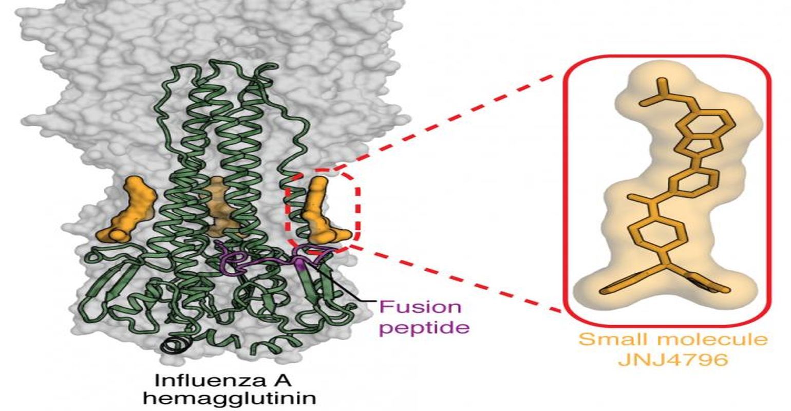 The researchers turned to a library of more than 500,000 drug-like molecules and, in a high-throughput experiment, tested whether any of the compounds could displace a small protein HB80.4 mimic of bnAb CR6261 from the influenza type 1 HA stem, suggesting that such molecules attached to the same spot on the virus. Multiple molecules turned up as positive on the screen, and optimization to produce better binding and pharmacokinetic properties resulted in JNJ-4796 being the most promising inhibitor. Structural work in the Wilson lab revealed the close mimicry of how JNJ4796 bound to the HA stem compared to bnAb CR6261.