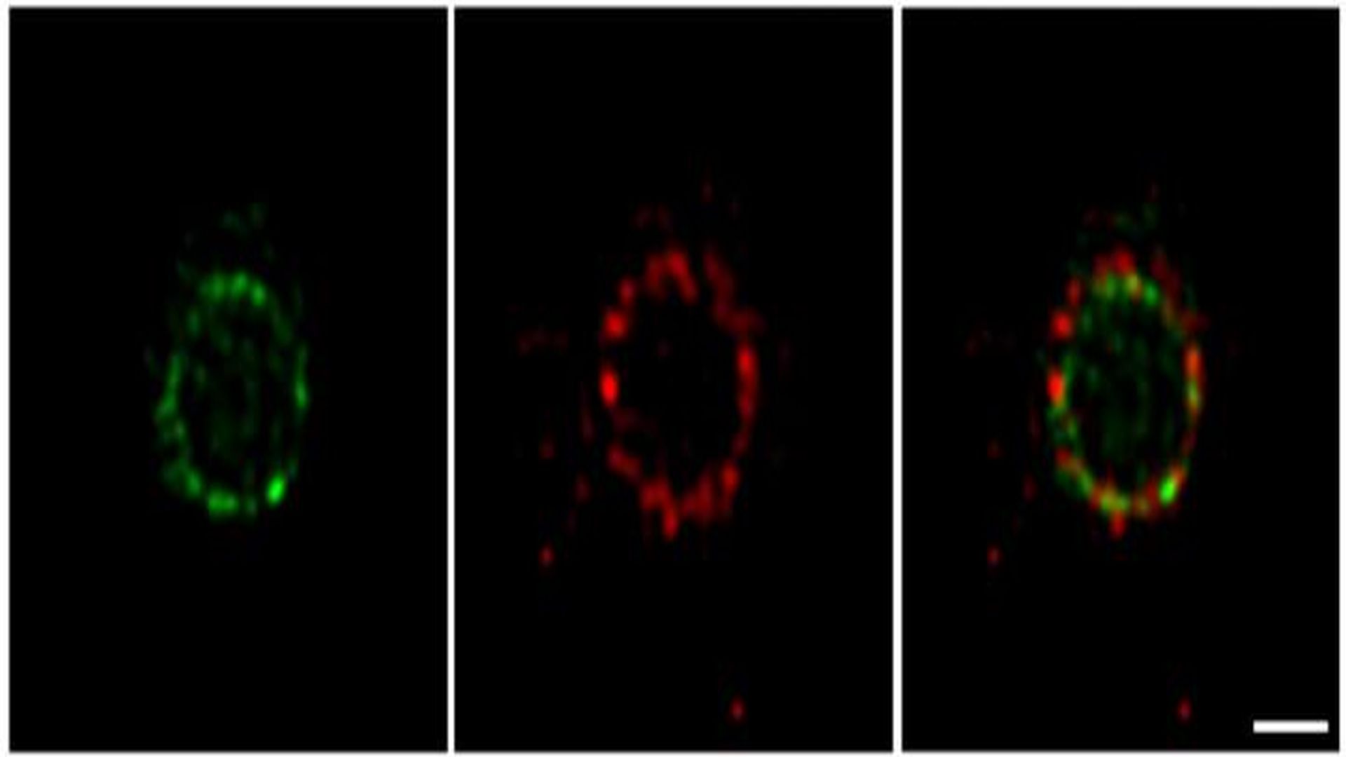 These are nanoscopic images showing the spatial organization of two cell division proteins in E. coli cells. FtsZ (green) and FtsN (red) are organized into patchy rings at the division site. Courtesy of OIST
