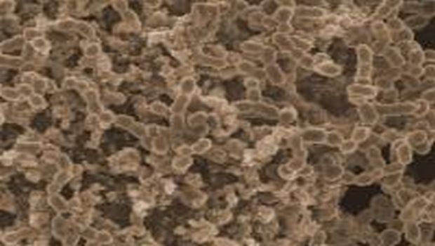 This SEM image shows a mature pneumococcal biofilm: the nearly round structures of S. pneumonaie bacteria are organizing together a matrix of smaller, oddly shaped material surrounding them that makes them more resistant to environmental stresses and antimicrobial agents. Image courtesy of Laura Marks.